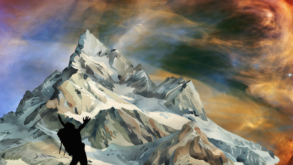 Editor’s Comments and Image Credit: Though there is no such nebula that is called the “rainbow nebula,” the abstraction is a symbol of hope. The image is composed of an exaggerated view of the colors of the Orion Nebula* (recently taken by both the Hubble Space Telescope (NASA) and the James Webb Telescope (ESA) that serves as the background for the mountains (a watercolor image by CleanPNG). Despite the arduous hike, a metaphor for surviving grief, a grateful hiker (pngtree) celebrates the view— arguably for herself and for the creator of all this beauty— which in itself, encapsulates hope, further accented by the lone star in the image.