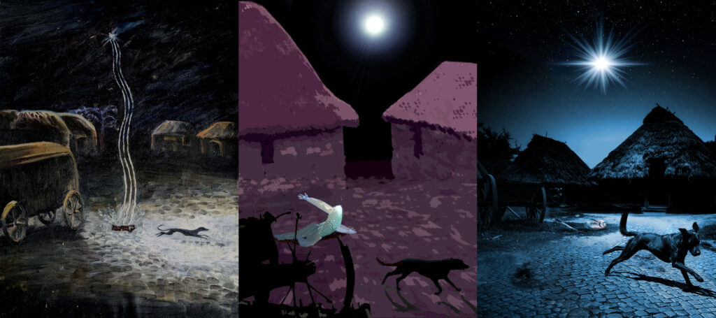 The left side of the triptych above shows one of those paintings, probably done in 1971. The central panel is a reworking of the dream idea from around 2013. To create it, I took my photographs of a wheel, a dog, a human model, and a fish and combined them with a photo of an indigenous village my grandmother had taken on a South American vacation. I used Gimp filters to meld everything and to create the star. The left panel I created this week, using Adobe Firefly. I generated a bunch of images with a prompt describing the scene, then chose a half dozen that got some element of the scene right and combined them, along with a couple additional images depicting details of the scene, adjusting the color, scale, rotation and boundaries of the various elements in Gimp until I had a whole that expressed the message of the dream.